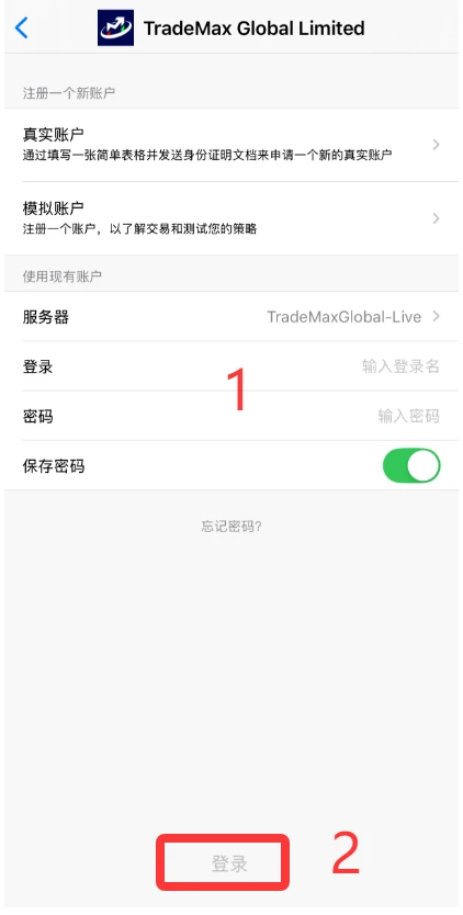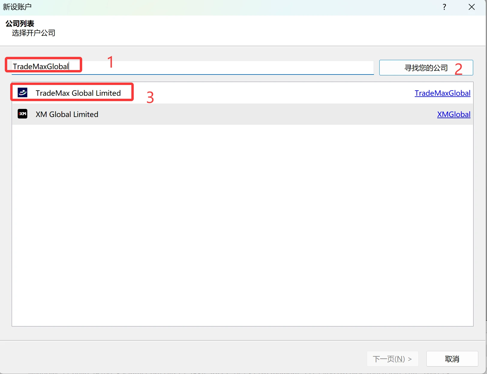 4.在上方输入服务器“TradeMaxGlobal”,并选择“TradeMax Global LMITED”